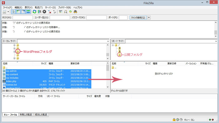 2.FTP ソフト「FileZilla」 で、解凍してできたファイルやフォルダを全て選択し、新しく作成したサブドメインの公開フォルダにアップロードする。