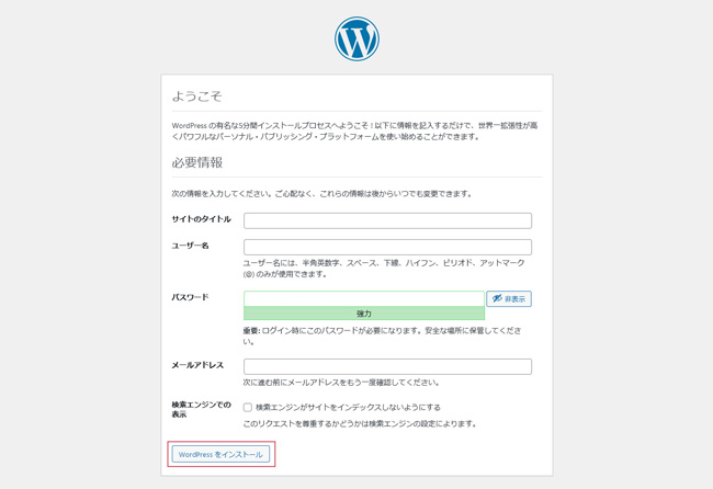 5.下記のサイト設定情報の入力し、「WordPress をインストール」をクリックする。