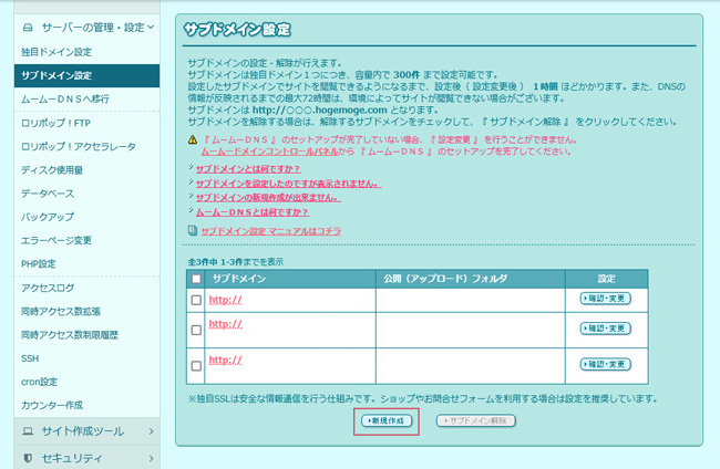 ロリポップのユーザー専用ページにログイン後、サーバーの管理・設定 > サブドメイン設定 >「新規作成」をクリック。