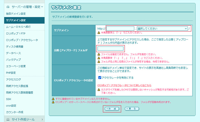 サブドメイン設定画面で、サブドメインと公開 (アップロード) フォルダを入力し、「作成」をクリック。