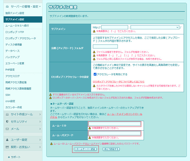 下部にネームサーバー認証画面が表示されるので、ムームーIDとムームーパスワードを入力し、「ネームサーバー認証」をクリック。