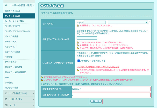 下部に確認画面が表示されるので、作成するサブドメインと公開フォルダを再度確認し、設定ボタンをクリックする。